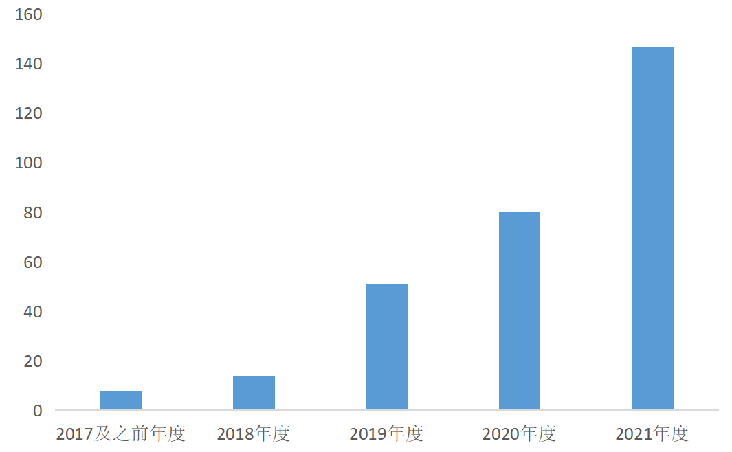 笔者以“私募基金”、“清算”共同作为关键词,在“威科先行?法律信息库”中进行检索,共有2,570条结果。为使检索结果更加精准及紧扣本文主题,笔者在此基础上,进一步增加“损失”作为关键词,并附加“裁判理由及依据”作为“搜索范围”,在“威科先行?法律信息库”中进行检索,截至2021年度共有300条结果;其中,2017年及之前年度有8件,2018年度有14件,2019年度有51件、2020年度有80件,2021年度有147件。