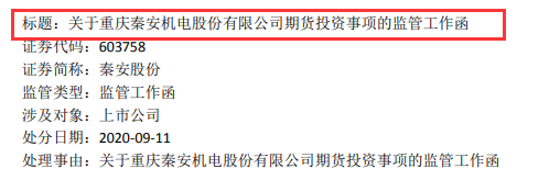 值得一提的是,传统的汽车零部件厂商转身成为期货操盘手也曾引起监管部门的关注,上交所曾于9月11日向秦安股份期货投资事项的监管工作函。