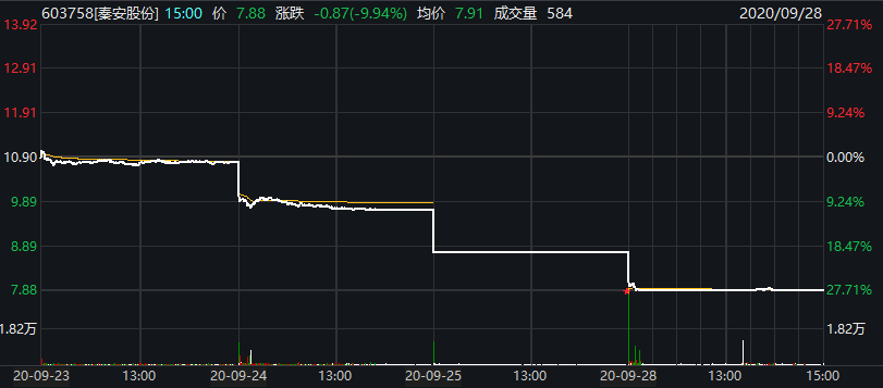 9月28日,秦安股份再度以跌停开盘,盘中一度打开跌停但随后再度走弱。截至收盘,秦安股份再度封在跌停板,报7.88元/股,跌回8月初的水平。