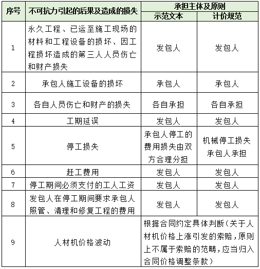 合同未做出明确约定时,则可以参考“示范文本”第17.3条的规定、“计价规范”等规定,因不可抗力影响承包人履行合同约定的义务,已经引起或将引起工期延误的,应当顺延工期,并免除因不可抗力导致的工期延误的违约责任。由此导致承包人停工的费用损失由发包人、承包人合理承担。具体分担原则如下:
