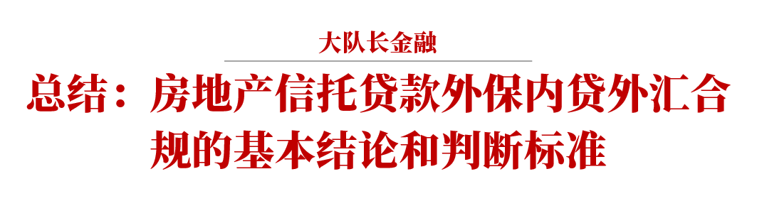 行文至此,根据29号文以及其他相关外汇管理规定,我们可以归纳出如下有关房地产信托贷款外保内贷是否合规的基本结论和判断标准:1. 信托贷款不是委托贷款,在遵守银保监会关于房地产融资要求以及29号文规定的前提下,可以办理外保内贷;2. 29号文并未禁止房地产企业境内贷款接受外保内贷安排;按照外汇局长期坚持的“无罪推定”、“负面清单”、“法不禁止即可为”的监管思路和原则,境内房地产贷款(包括信托贷款、银行贷款),在遵守29号文规定的情况下,也可以办理外保内贷;3. 在境外担保履约之前,房地产信托贷款外保内贷项下的境外担保并未产生外债,只要在设置担保的时候交易各方并无故意促成担保履约,则不存在境内房地产企业违规借入外债的问题,只要遵守了29号文的其他相关规定,房地产信托贷款外保内贷安排并不违规;4. 在境外担保履约后,境内房地产企业(作为境内借款人)存在违规风险:境外担保履约后,境内房地产企业产生对外负债,在目前限制房地产企业举借外债的监管体制下,很可能不适用29号文规定的1倍净资产的额度标准,因此,境内房地产企业很可能会因没有外债额度而构成《外汇管理条例》第43条规定的“擅自对外借款”,而有被处罚的风险;5. 在境外担保履约后,虽然境内房地产企业作为境内借款人可能存在违规外债风险,但是,只要境内债权人(信托公司)已经按照29号文要求履行担保履约倾向尽职审核、已经按照29号文的规定及时向外汇局资本项目系统报送外保内贷业务数据等前提下,境内信托公司并不违反29号文或其他外汇管理规定。在分析外保内贷的外汇合规性问题时,根据债权担保交易的基本法律结构和29号文所体现的外汇监管原则,实务中要注意区分履约前和履约后的不同情况、分清债务人和债权人的不同责任,不能混同而一概而论,具体来说: