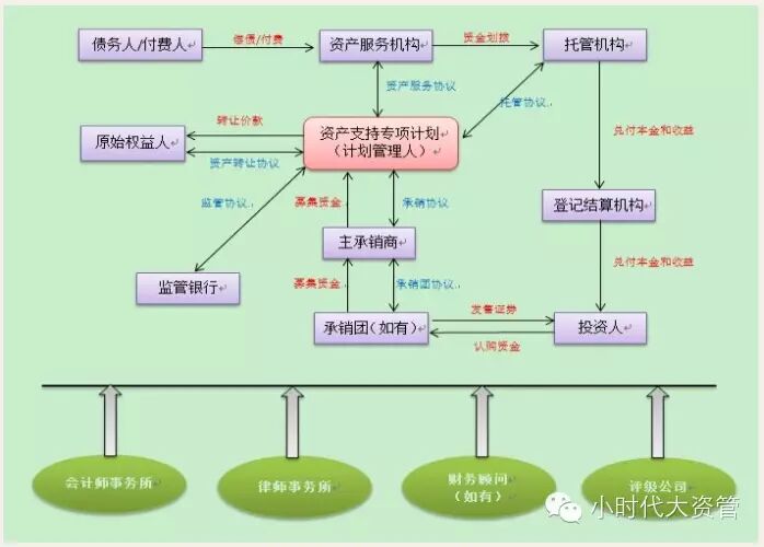 企业资产证券化业务涉及到的相关各方主要包括原始权益人(发起人)、计划管理人、主承销商、资产服务机构、会计师事务所、律师事务所、评级公司、交易所、基金业协会、资产托管机构、资金监管机构、证券登记结算机构、计划推广人、财务顾问(不一定有)等。在基本的交易结构中,各方之间的关系如下图所示: