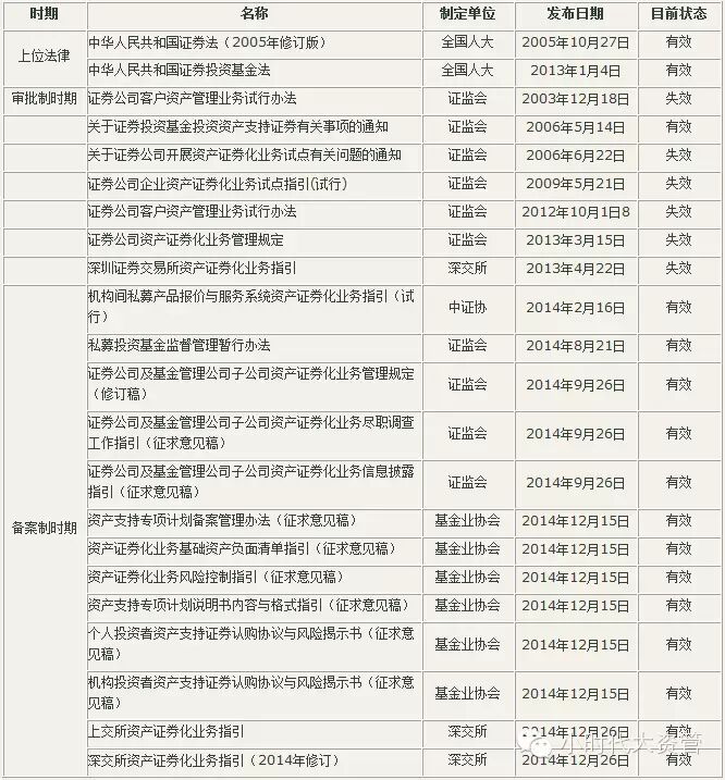 2014年11月19日,证监会发布了《证券公司及基金管理公司子公司资产证券化业务管理规定》及配套工作指引,将特殊目的载体由之前的专项资产管理计划变更为资产支持专项计划(下文简称“专项计划”);取消事前行政审批,改为事前由交易所核查,事后在中国证券投资基金业协会(以下简称“基金业协会”)备案;实行基础资产负面清单管理,负面清单由基金业协会制定并负责定期更新;授予了基金子公司计划管理人资格;另外,增加了机构间私募产品报价与服务系统作为合格的挂牌、转让场所。