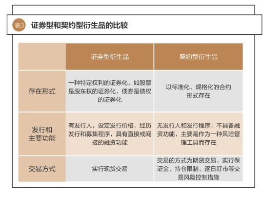 表3比较了证券型衍生品和契约型衍生品。可以看出,《期货法》涉及的衍生品主要是契约型衍生品。因此,我们有必要将《证券法》中提到的“证券衍生产品”和《期货法》涉及的“契约型衍生品”做好区分,明确界定各自的监管边界。
