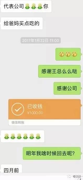 过年前,王某通过微信转账,给了陈小梅1000元。“这可能算是年终奖吧。”。一如既往,王某每次聊天几乎都会提到“小心”,但没有给出被发现后的应对办法。