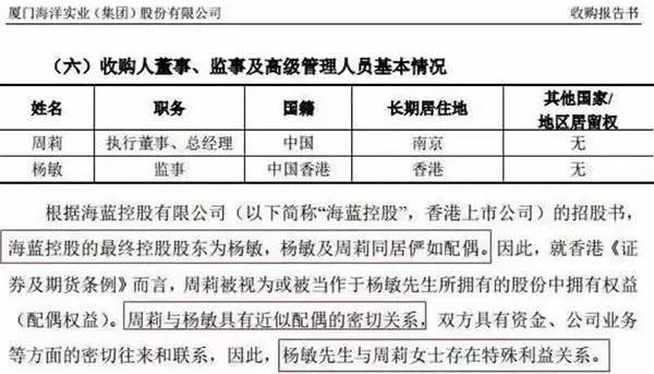 这家从主板退市的挂牌公司厦门海洋实业(集团)股份有限公司(简称:海洋3,代码:400022)11月28日披露的《收购报告书》中这样写:海蓝控股的最终控股股东为杨敏,杨敏及周莉同居俨如配偶。