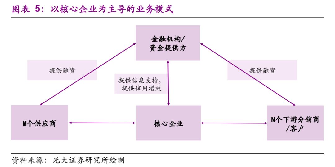 以核心企业为主导的供应链金融模式最为常见,金融机构出于对核心企业资信的认可向供应链上下游提供资金支持。此类供应链一般存在于重资产行业,核心企业对产业链上下游往往有较强的控制力度,呈现“M+1+N”运作模式,例如汽车、重工机械等。