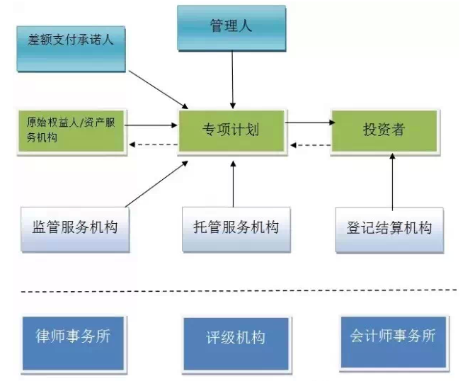 4、中介机构:一般包括资产服务机构(一般由原始权益人担任)、评级机构、托管机构、担保机构、律师事务所、会计师事务所等。