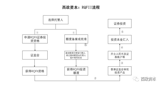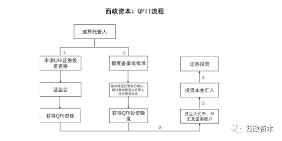 向证监会申请资格,证监会审核(证监会征求外汇局意见)——经批准的,颁发证券投资业务许可证——基础额度内,向托管行提供资料并通过托管行申请基础额度备案(备案);超过基础额度的,通过托管行向外管局申请,并经外管局批准(批准)——托管人处开立外汇账户和人民币特殊账户——在投资额度内,可投资于证监会批准的人民币金融工具或委托境内的证券公司等投资管理机构,进行境内证券投资管理;若投资境内股票的,应遵守证监会规定的持股比例限制等(具体投资范围可参见证监会公告〔2012〕17号文)。