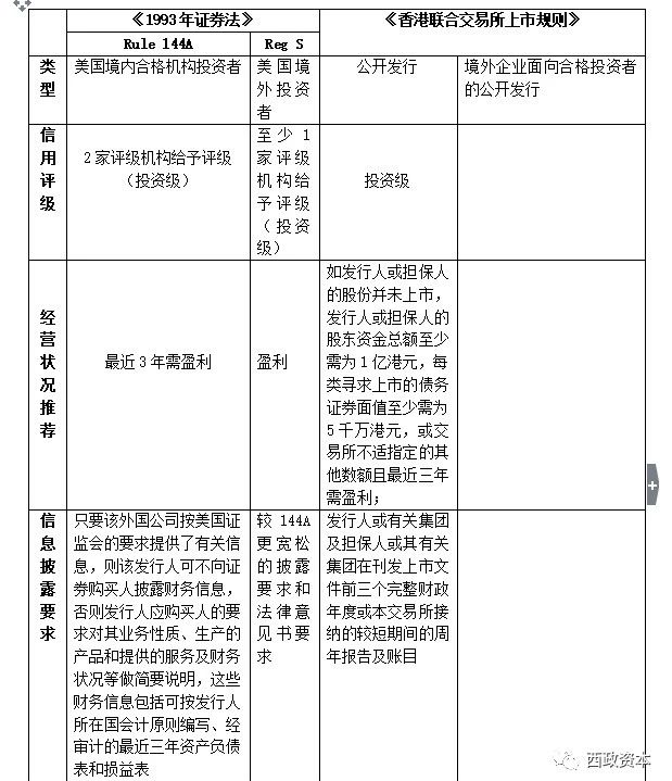 目前境外发债部分主要以美国证监会及香港联交所的相关规定为主(下表系根据网络内容整理)