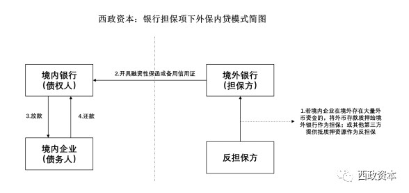 外保内贷是指担保人注册地在境外、债务人和债权人注册地均在境内的跨境担保。在境外银行或企业提供担保的前提下,境内银行向境内企业提供贷款或授信。外保内贷业务模式可分为银行担保项下的外保内贷模式(即银行作为担保方)以及企业担保项下的的外保内贷业务模式(如境外上市母公司作为担保方与境内银行签署保证合同,由境内公司获得融资),其中银行担保项下的外保内贷模式最为常见。其基本架构如下: