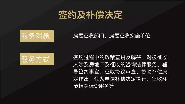 我们把一个征收项目分成四个模块:产权调查、征收决定、现场服务,以及最后的补偿争议解决和强制执行。每一个模块的服务内容和服务收费都是不一样的。