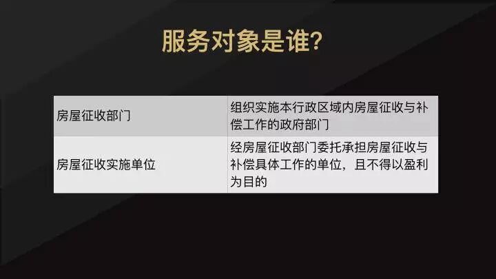 项目确定委托关系后,我们要明确服务对象。因为在征收过程中,往往有两个单位:征收部门和征收实施单位。根据条例规定,征收部门是由区县人民政府确定的。基本上,目前所有的房屋征收实施单位都是乡镇街道。