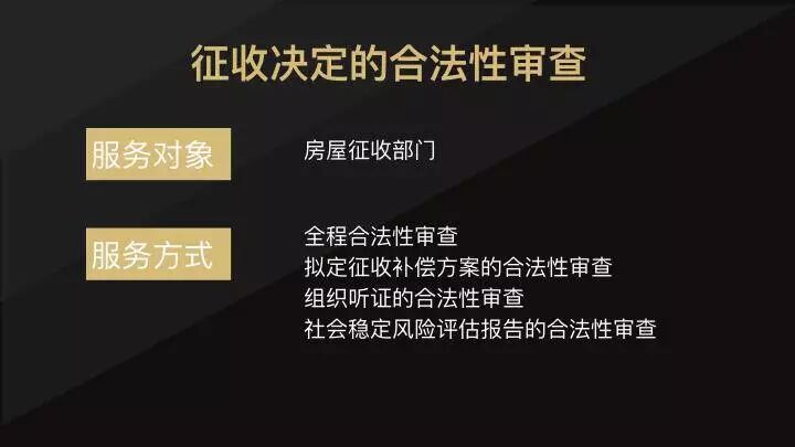 除了征收决定和征收补偿方案,以后如果要做补偿决定的,对补偿决定的合法性也要进行合法性审查,这也是可以单独切割开来作为专项的法律服务项目。