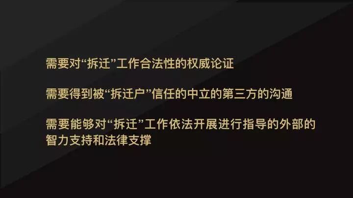 我们要结合政府法律服务,找准拆迁当中法律服务的痛点和政府的需求。同时,要保证政府行为的合法性,防止政府的履职风险,这是我们工作的核心。把握这个核心后,所有的政府法律服务问题都能套用这个思路解决。