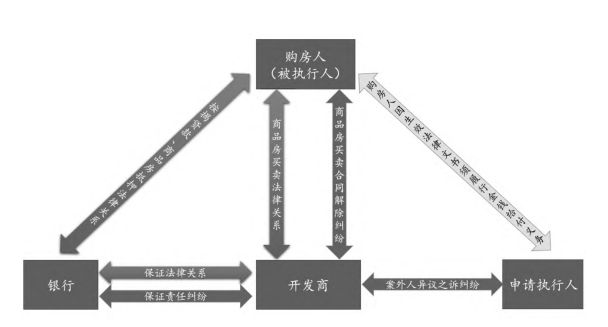 (图1购房人、银行、开发商、申请执行人之间的法律关系和民事纠纷)