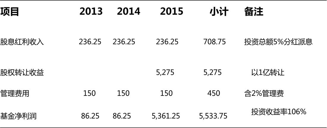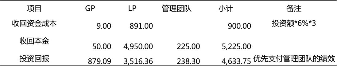2013年初,西政创投投资甲项目4725万元,其中基金投入4500万元,GP管理团队以风险准备金形式配比投资225万元,该项目每年固定分红为投资额的6%,西政创投每年日常管理用150万元,含向基金管理人支付管理费,2015年末西政创投以1亿元转让该项目实现盈利退出。