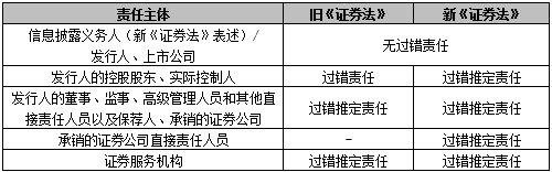 笔者认为,与旧《证券法》相比,新《证券法》中证券虚假陈述的责任主体适用的归责原则发生变化,加重了发行人的控股股东、实际控制人的责任,明确承销的证券公司直接责任人员的责任,具体如下表: