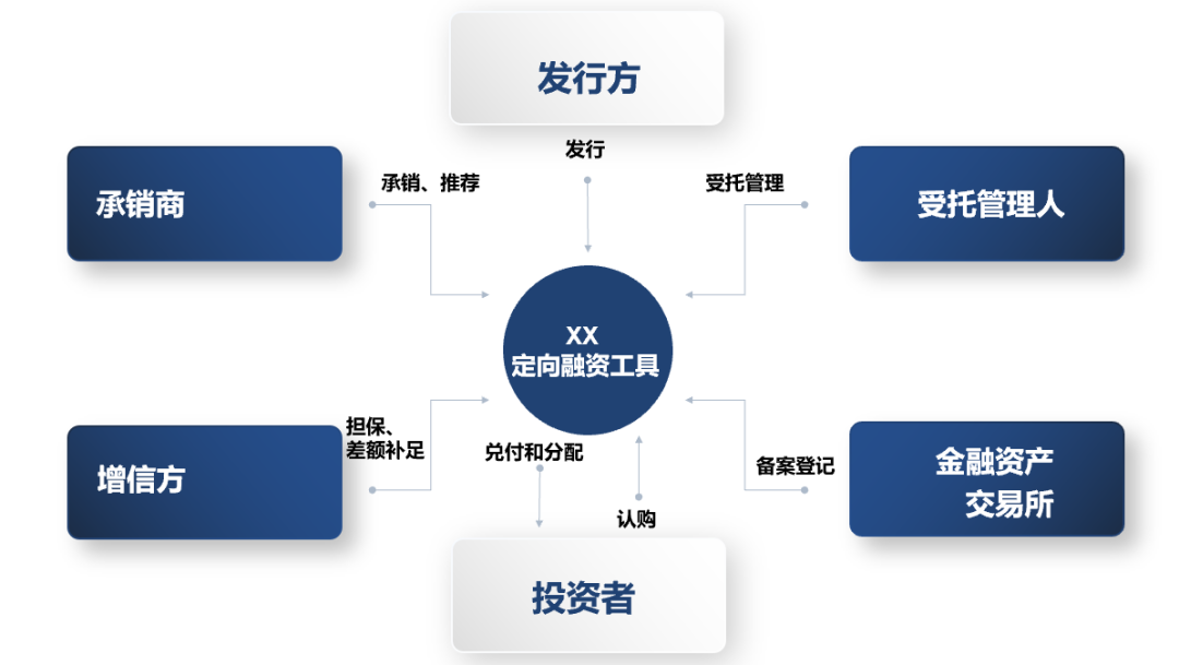 定向融资工具的参与方有承销商、受托管理方、增信方、投资人、发行方、资金监管方、挂牌场所、登记场所、中介机构等。
