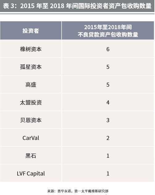 随着不良贷款交易透明度提升,同时市场进一步向国际投资者开放,许多国际不良贷款买家将视线投向中国市场。深圳前海金融资产交易所数据显示,2018年境外收购中国不良 贷款资产包总额约为人民币300亿元,约为2017年的3倍。表现活跃的国际投资者包括橡树资本、孤星资本、高盛、贝恩、太盟投资和CarVal,除不良贷款资产包以外,对单项债权投资的兴趣也有所增加。