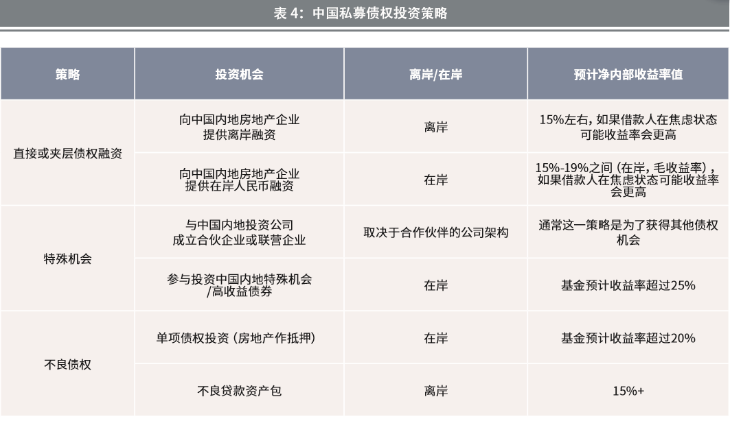 尽管中国大型开发商可能仍能通过银行、股权融资或者发行债券等方式获得贷款,但是大部分中国开发商都面临融资受阻的问题,特别是过去依靠影子银行获得资金的小型开发商。国际私募债权投资者纷纷看准这个机会,希望能够为有足够抵押保证或者信誉保证的开发商们提供急需的资金。
