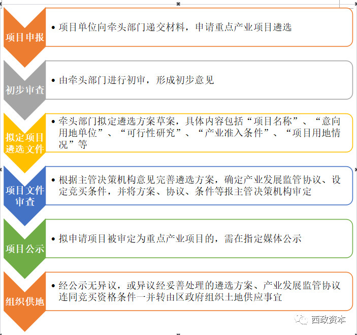 根据《深圳市级重点产业项目遴选实施办法》及相关配套规定,重点产业项目的引入及用地供应流程包括“项目申报”、“初步审查”、“拟定项目遴选文件”、“项目文件审查”、“项目公示”、“组织供地”等。具体如下所述: