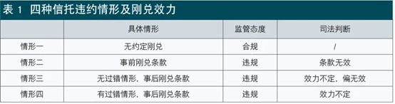 根据约定时信托违约是否已经发生,“刚性兑付”可以分为事前刚兑和事后刚兑。通过下表,我们可以看到四种信托违约时,刚性兑付的约定情况、监管部门的态度和司法机关的效力判断。