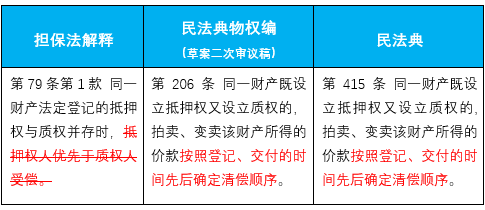 《民法典》第415条的规定,弥补了《物权法》的漏洞,以立法明确了抵押权、质权并存时顺位如何确定的问题,有助于解决当事人对权利顺位的争议。