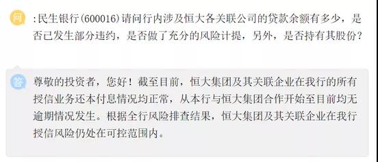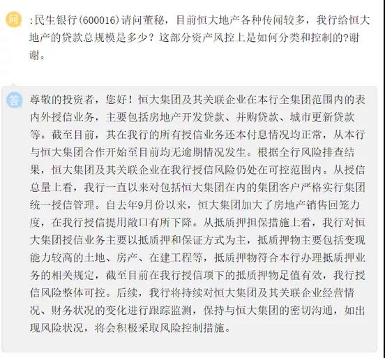 民生银行在上海证券交易所的互动平台回答投资者问题时表示,该行与恒大集团合作开始至目前均无逾期情况发生。“根据全行风险排查结果,恒大集团及其关联企业在我行授信风险仍处在可控范围内。”