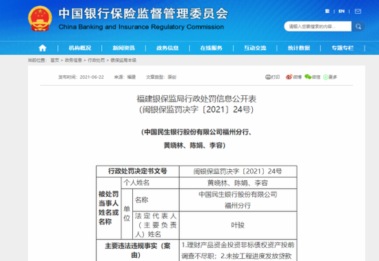 6月22日,福建银保监局公布罚单显示,民生银行福州分行因“理财产品资金投资非标债权资产投前调查不尽职;未按工程进度发放贷款”两项案由被处以100万元罚款。同时,该行黄晓林、陈娟、李容三名责任人被予以警告。