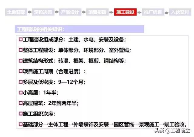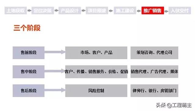 工程部:施工进度达到预售条件。(产品类型不同、城市不同,情况有异)