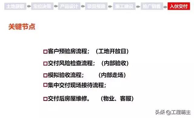 工程部:组织各专项验收——竣工验收(毛坯)——组织整改——移交物业。(精装修一般都是毛坯入伙后,委托开发商装修,单独签订协议。政府验收标准?质量衡量标准?)