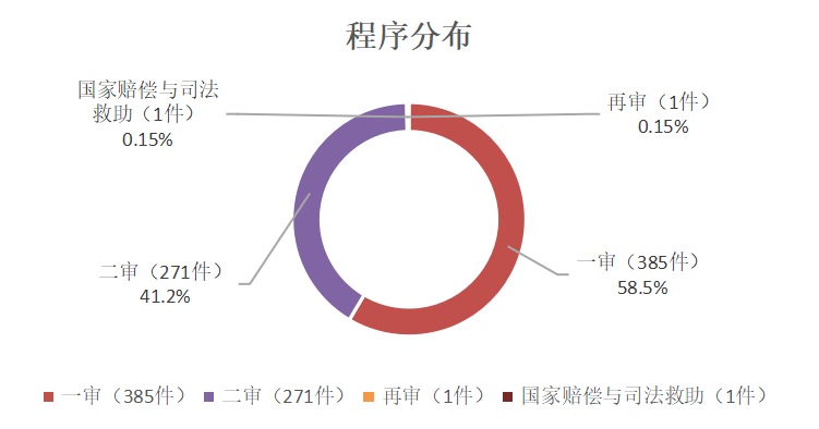 一审案件有 385 件,占比 58.5%;二审案件有 271 件,占比 41.2%;再审案件与国家赔偿与司法救助案件均只有 1 件。