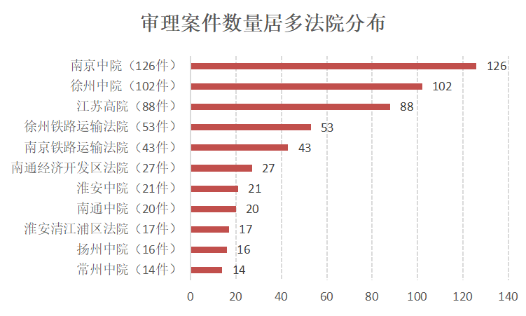 从审理法院分布来看,当前集体土地征收案件的审理法院主要集中在南京中院、徐州中院、江苏高院、徐州铁路运输法院、南京铁路运输法院等。其中南京中院的案件量最多,达到 126 件。