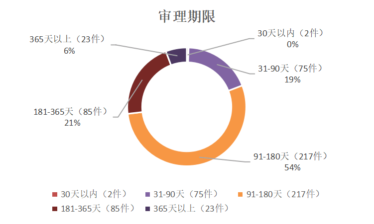 通过对审理期限的可视化分析可以看到,当前条件下的审理时间更多处在 91-180 天的区间内,平均时间为 176 天。