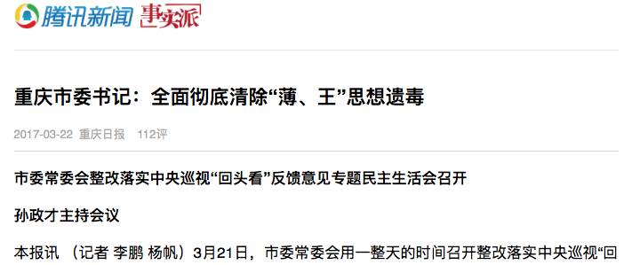 2017年3月21日,重庆市委常委会召开整改落实中央巡视“回头看”反馈意见专题民主生活会,市委书记孙政才在总结讲话时指出,要切实提高认识,增强政治敏锐性和政治鉴别力,全面彻底清除“薄、王”思想遗毒。