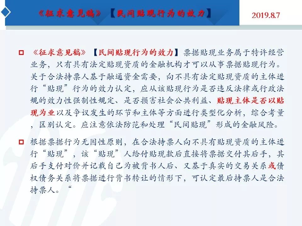如何理解“贴现”为业的行为涉嫌犯罪,有律师认为,《九民纪要》是依据《刑法》第二百二十五条规定“未经国家有关主管部门批准,非法从事资金支付结算业务的,构成非法经营罪。”来认定涉嫌犯罪。但在2013年10月,最高检察院在函复福建省检察院关于买卖银行承兑汇票行为如何适用法律问题的意见中就表示“汇票买卖行为不同于支付结算行为,建议按照案件的具体情况依法处理。”笔者认为,现行商业汇票的买卖交易都采取票款即时对付的交割模式,不存在买票人账户因支付时间差而获取沉淀资金的情况,也就不存在支付结算行为,其实质应该属于放贷行为。