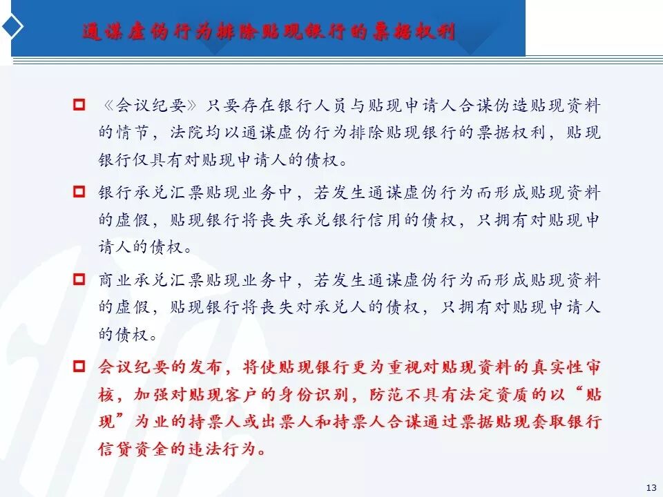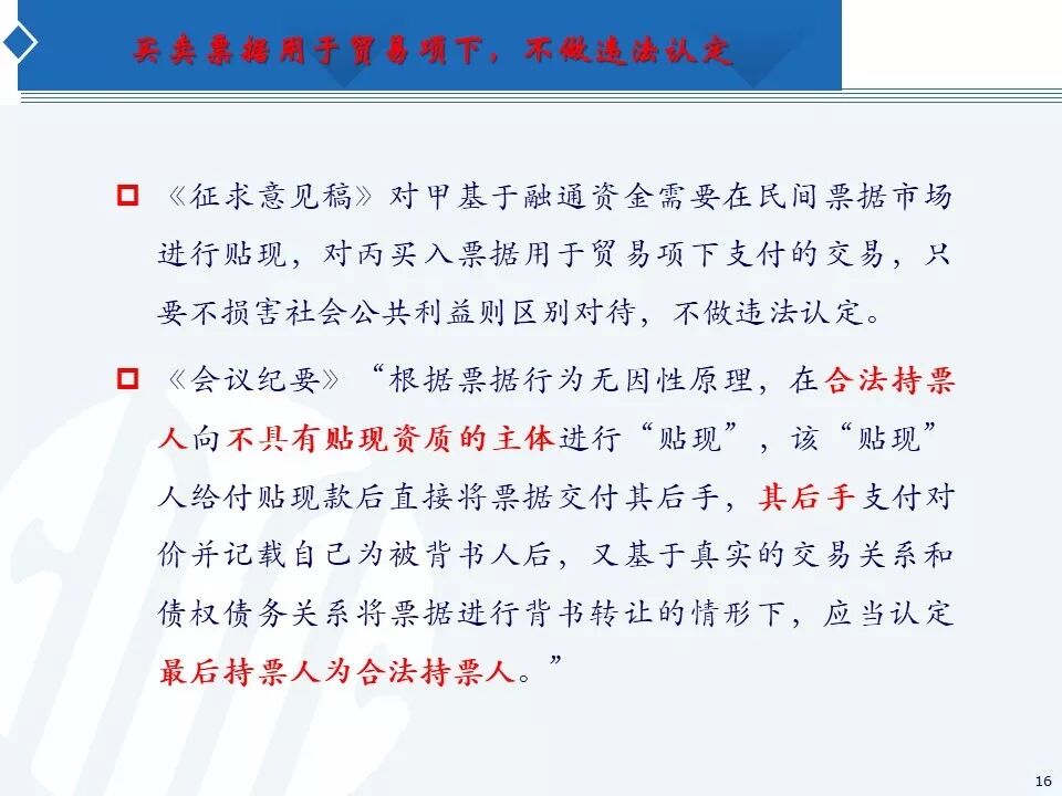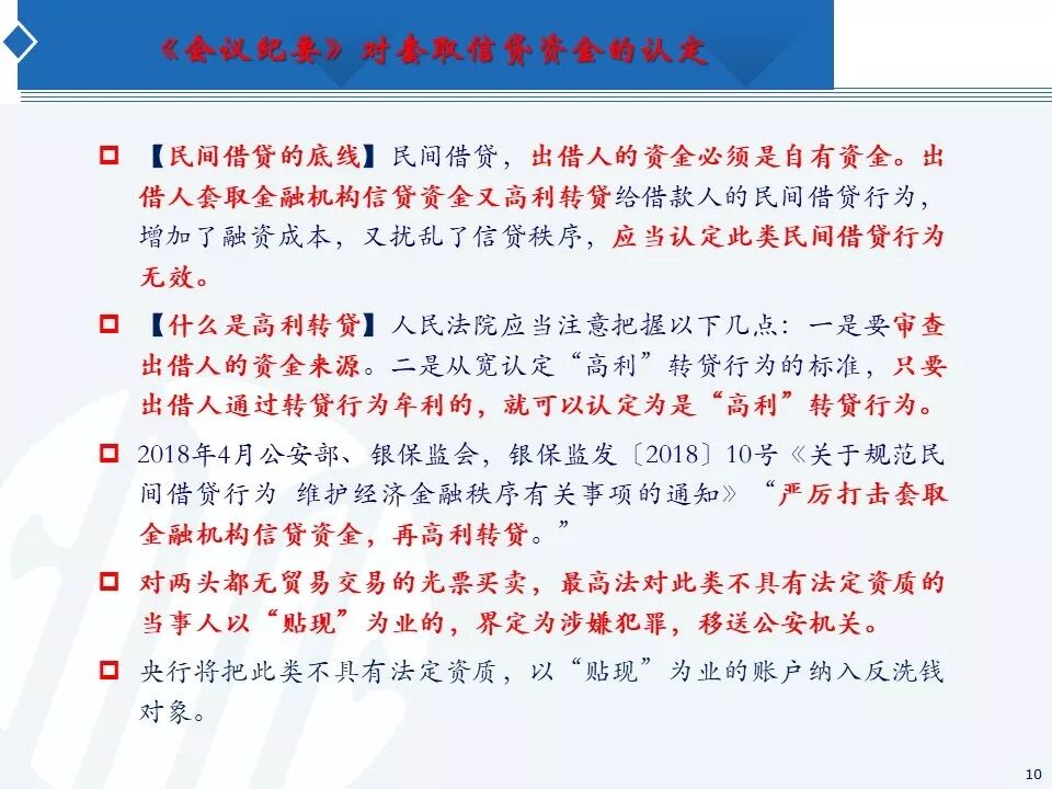 由此可见,《九民纪要》认定对“不具有法定资质的当事人以“贴现”为业的行为涉嫌犯罪的实质要件是“以贴现为业”和“套取金融机构信贷资金进行转贷”。因此,民间票据交易中切不可触碰这两条红线。
