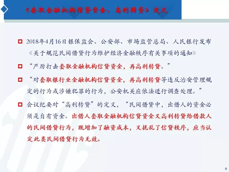 四部委《关于规范民间借贷行为维护经济金融秩序有关事项的通知》将高利转贷也列入涉嫌犯罪。《九民纪要》中对“高利转贷”作了定义,“民间借贷中,出借人的资金必须是自有资金。出借人套取金融机构信贷资金又高利转贷给借款人的民间借贷行为,既增加了融资成本,又扰乱了信贷秩序,应当认定此类民间借贷行为无效。人民法院在适用该条规定时,应当注意把握以下几点:一是要审查出借人的资金来源。借款人能够举证证明在签订借款合同时出借人尚欠银行贷款未还的,一般可以推定为出借人套取信贷资金;二是从宽认定“高利”转贷行为的标准,只要出借人通过转贷行为牟利的,就可以认定为是“高利”转贷行为。”亦即,以套取信贷资金转贷的,都为高利转贷。