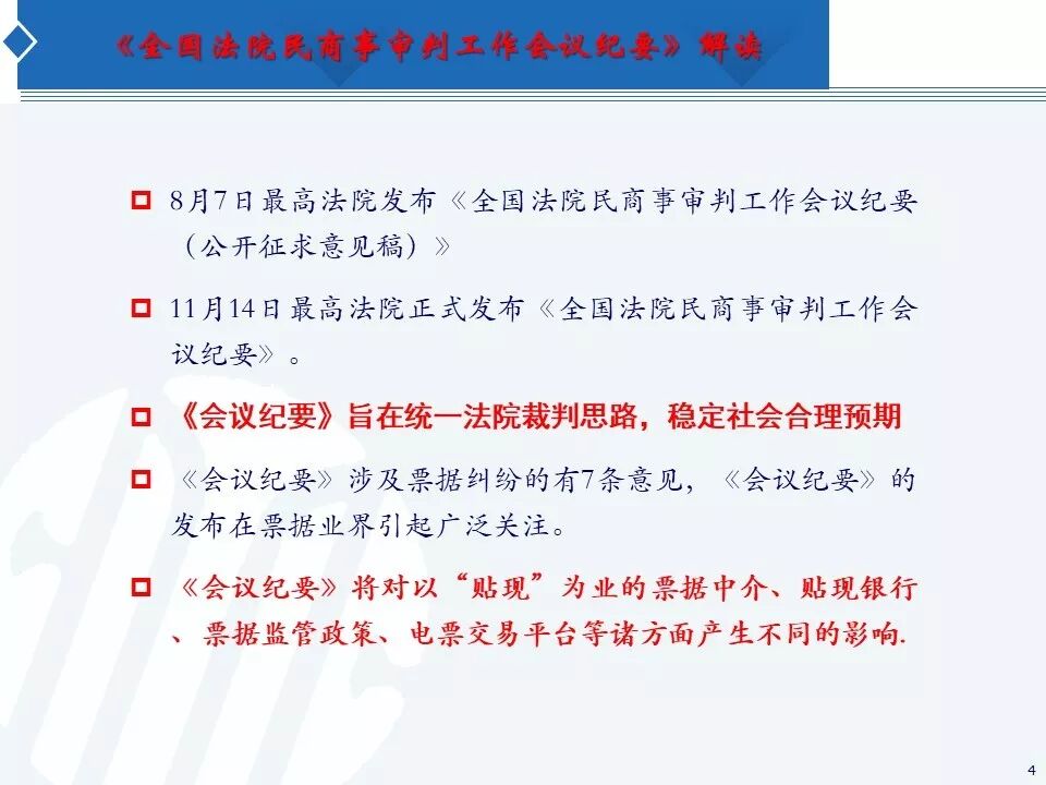 最高法院11月14日发布《2019年全国法院民商事审判工作会议纪要》(下称《九民纪要》),《九民纪要》旨在统一法院裁判思路,稳定社会合理预期。《九民纪要》涉及票据纠纷的有7条意见,《九民纪要》的发布在票据业界引起广泛关注。