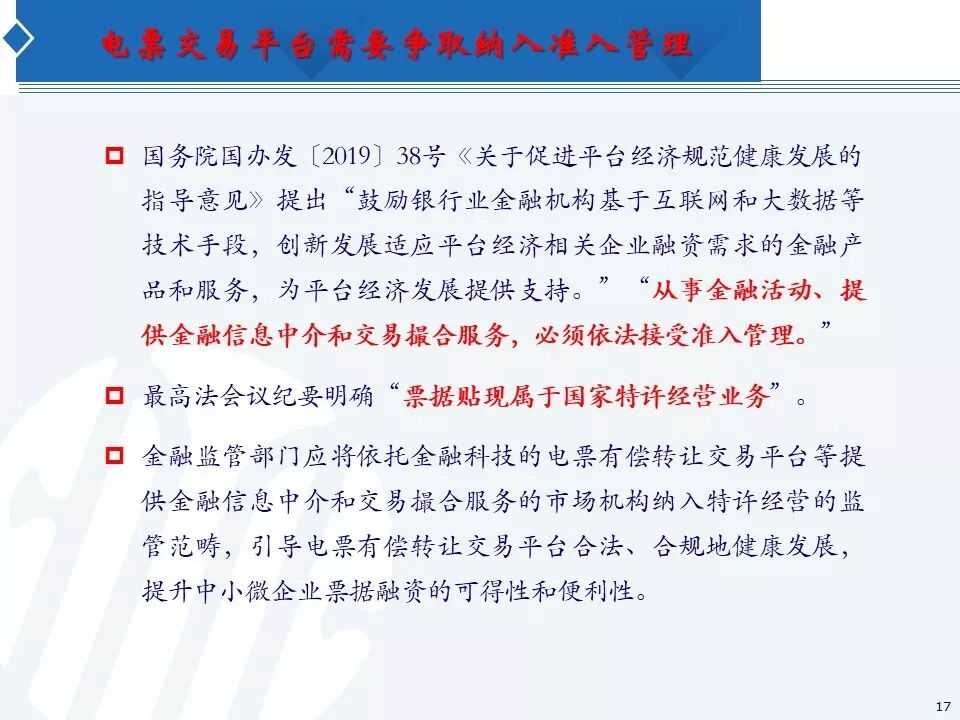 《会议纪要》对民间票据交易取缔后,在净化票据市场的同时,也会对合法持票人为融通资金与买入票据用于贸易项下支付的中小微企业间合理的票据融资交易形成障碍,由此会导致供应商不愿接受预付款票据(因发票尚未开出,无法向银行申请贴现),或需要中小微企业以货币资金支付预付款,从而增加中小微企业采购成本。为此,需要金融监管部门将依托金融科技的电票有偿转让交易平台等提供金融信息中介和交易撮合服务的市场机构纳入特许经营的监管范畴,引导电票有偿转让交易平台合法、合规地健康发展,提升中小微企业票据融资的可得性和便利性。
