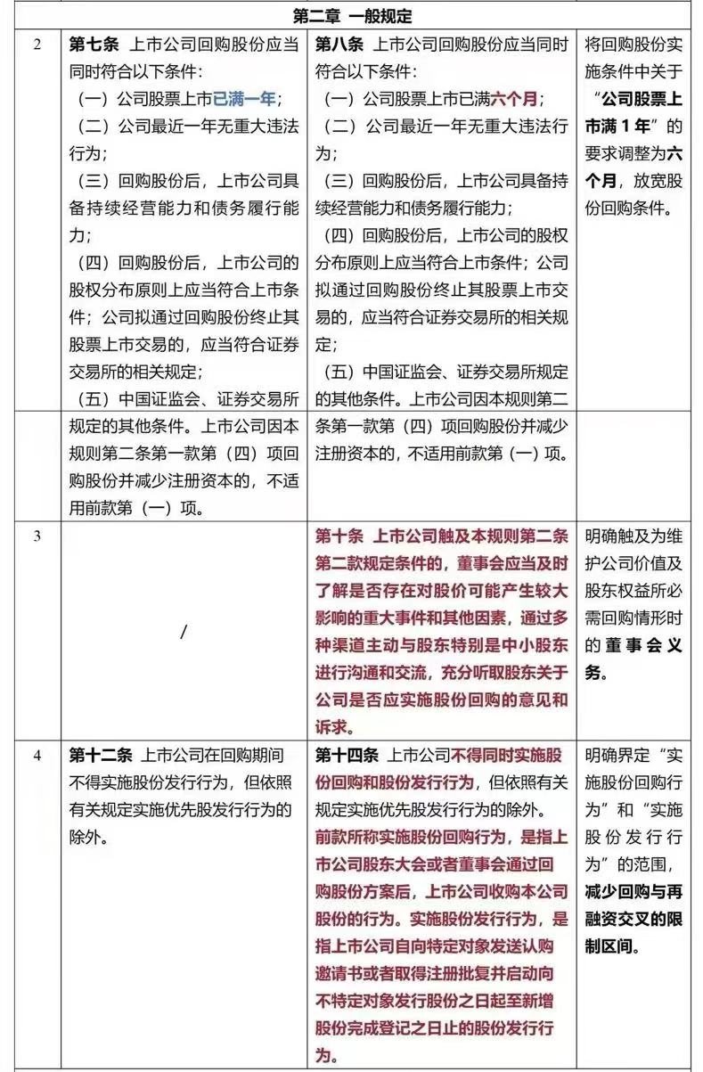 以下为新旧《上市公司股份回购规则》主要修订内容对比及简要分析,左侧为修订前规则,右侧为新规,蓝色为删减内容,红色为增加/变更内容。