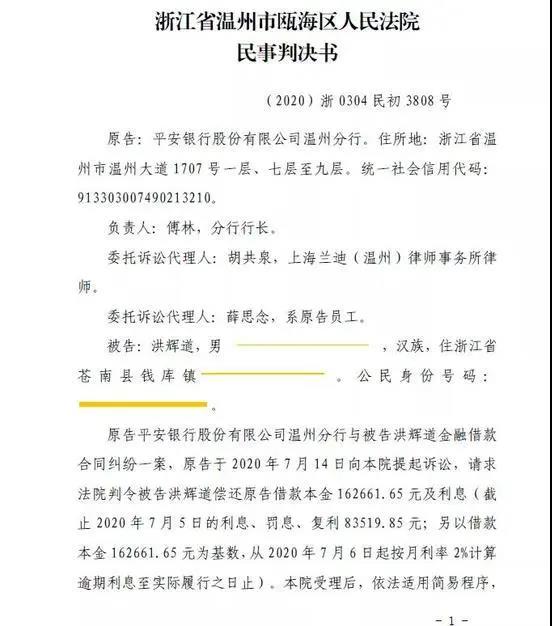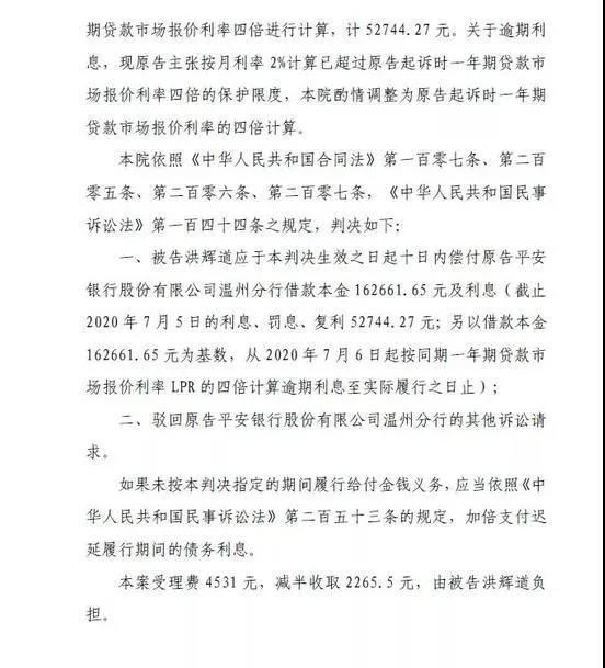 一、被告洪辉道应于本判决生效之日起十日内偿付原告平安银行股份有限公司温州分行借款本金162661.65 元及利息(截止2020 年7 月5 日的利息、罚息、复利52744.27 元;另以借款本金162661.65 元为基数,从2020 年7 月6 日起按同期一年期贷款市场报价利率LPR 的四倍计算逾期利息至实际履行之日止);