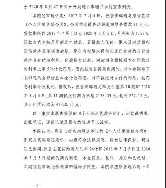 若借款人任何一期未及时足额归还借款本息即视为逾期,原告有权要求提前归还已发放的全部贷款本金并结清利息,自逾期之日起,对逾期金额按照本合同约定的利率上浮50%计收罚息,因此被宣告提前到期的,对本合同项下未归还的全部借款本金计收罚息,对不能按时支付的利息,按罚息利率计收复利。借款后,被告洪辉道足额支付至第10 期即2018年5 月4 日,第11 期仅支付期内利息2138.39 元、复利227.11 元,共计已偿还本金47338.35 元。