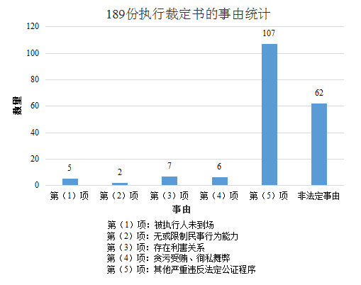 《公证执行规定》第12条确定了启动不予执行异议程序的五项法定事由。据此规定对189份执行裁定书统计如下: