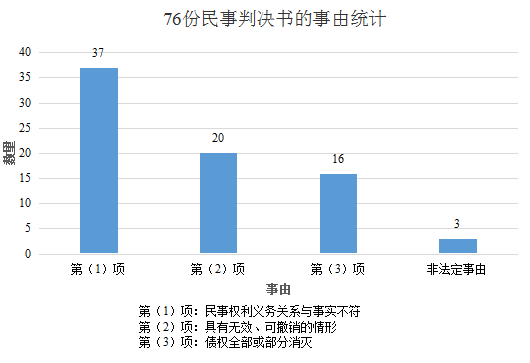 《公证执行规定》第22条确立了起诉不予执行诉讼程序的三项法定事由,按此规定对76份民事判决书统计如下: