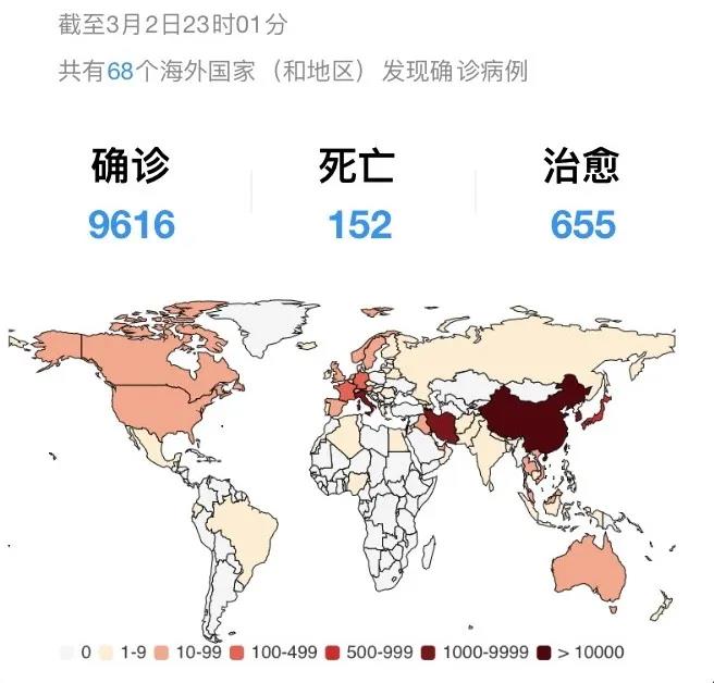 目前,虽然中国国内的疫情已经得到了初步的控制,新冠肺炎还继续在世界其他国家肆虐,截止到2020年3月2日的情况如下: