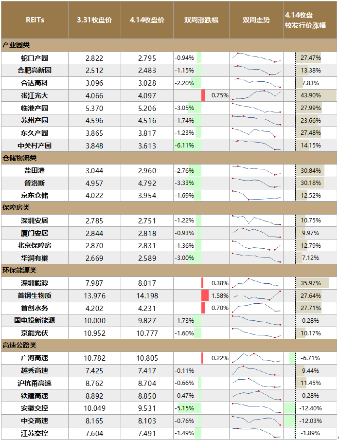 图表二:C-REITs各只产品双周涨跌幅及价格走势