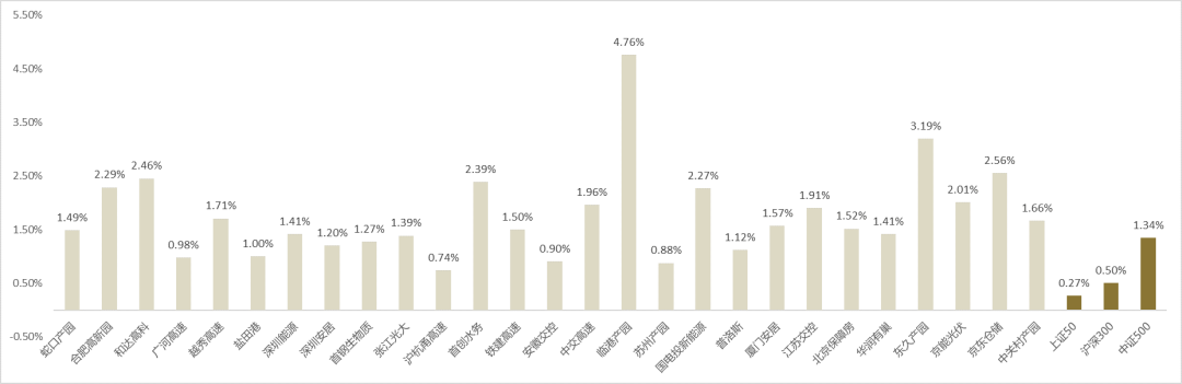 产业园板块作为受经济复苏传导较慢的行业,业绩复苏预期较为迟缓,除张江光大REIT上涨外,其余全部下跌,其中中关村REIT(-6.11%)领跌所有产品;