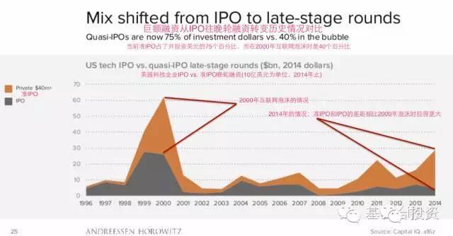 如图所示上市前融资的规模如今已经和2000年互联网泡沫相当,而不同的是非上市融资的规模要远远大于IPO融资规模,融资也更加容易,可见对于很多独角兽而言保持非上市状态也许会认为是更加理想的状态。